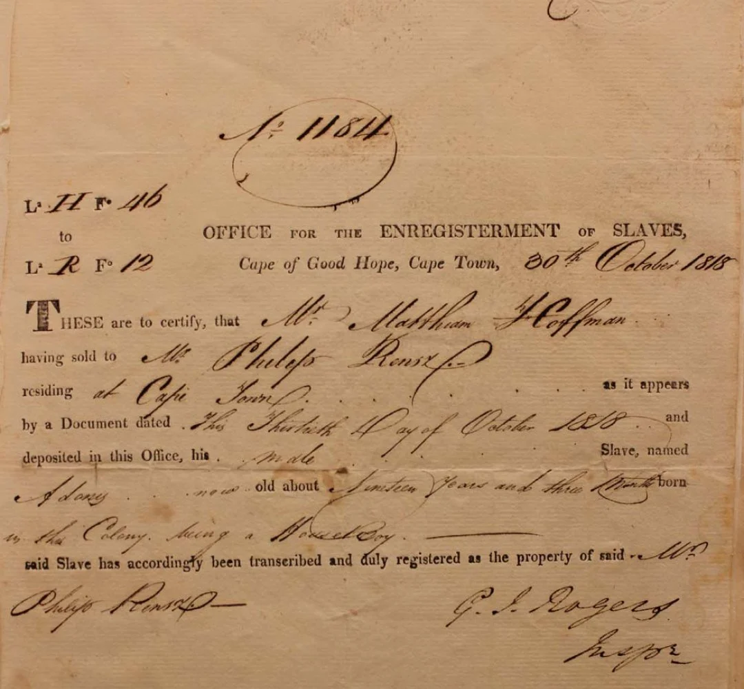 By 1807 the Cape was part of the British Empire and therefore influenced by decisions made in London. The British ban on the slave trade meant that no more enslaved people could legally be sent to work at the Cape. Those already enslaved here, and their new-born children however remained the 'property' of their 'owners' and could still be sold.